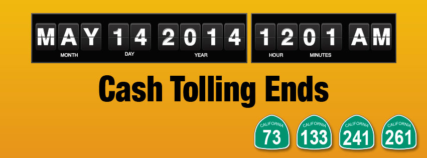 May 13 is the last day to pay with cash on The Toll Roads (State Routes 73, 133, 241 and 261). Cash toll collection will cease on the roadways on Wednesday, May 14, at 12:01 a.m.